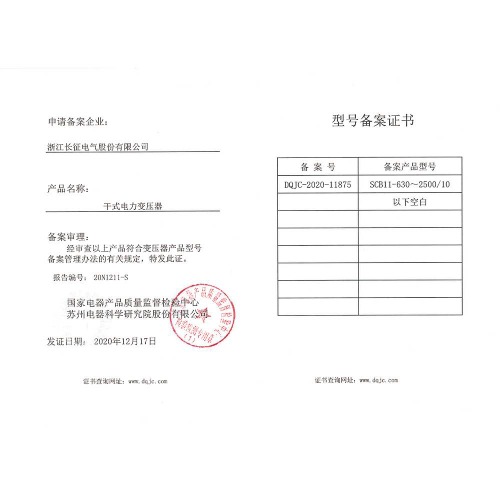 SCB10-630~2500/10干式电力变压器 型号备案证书