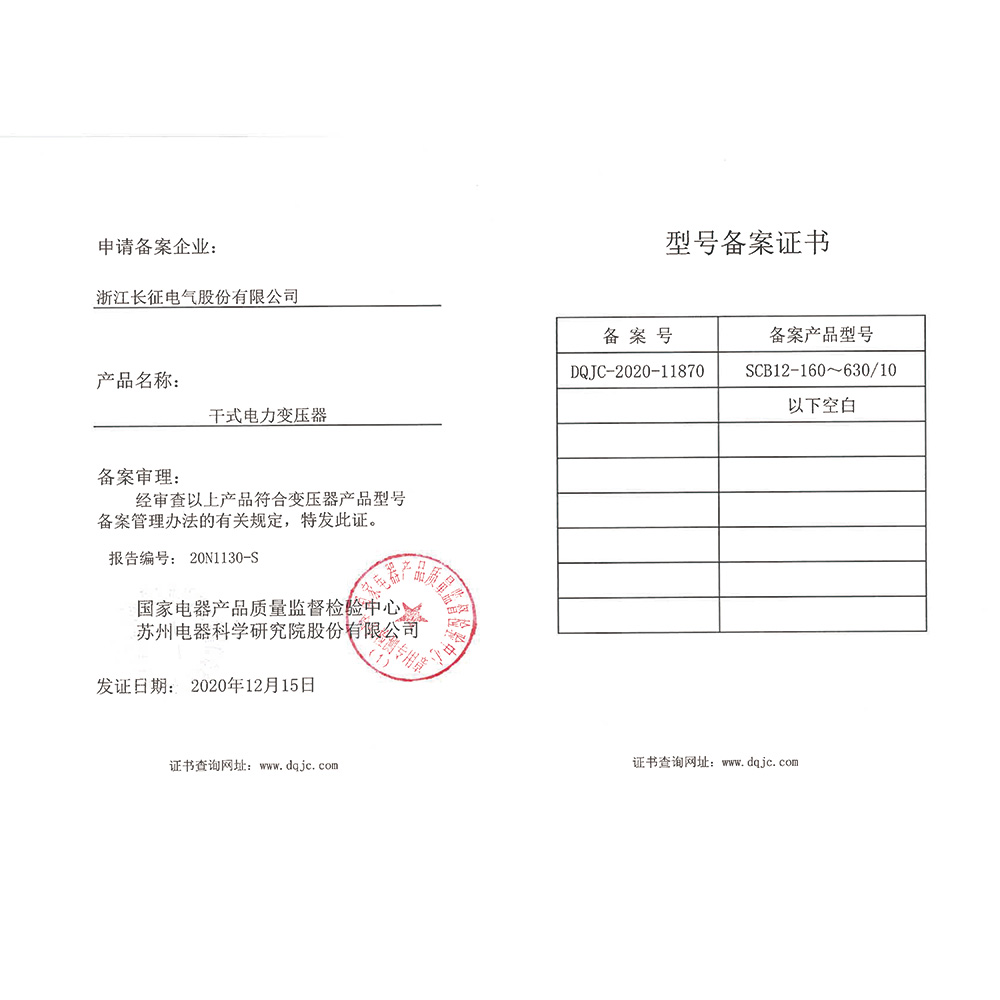 SCB10-160~630/10干式电力变压器 型号备案证书