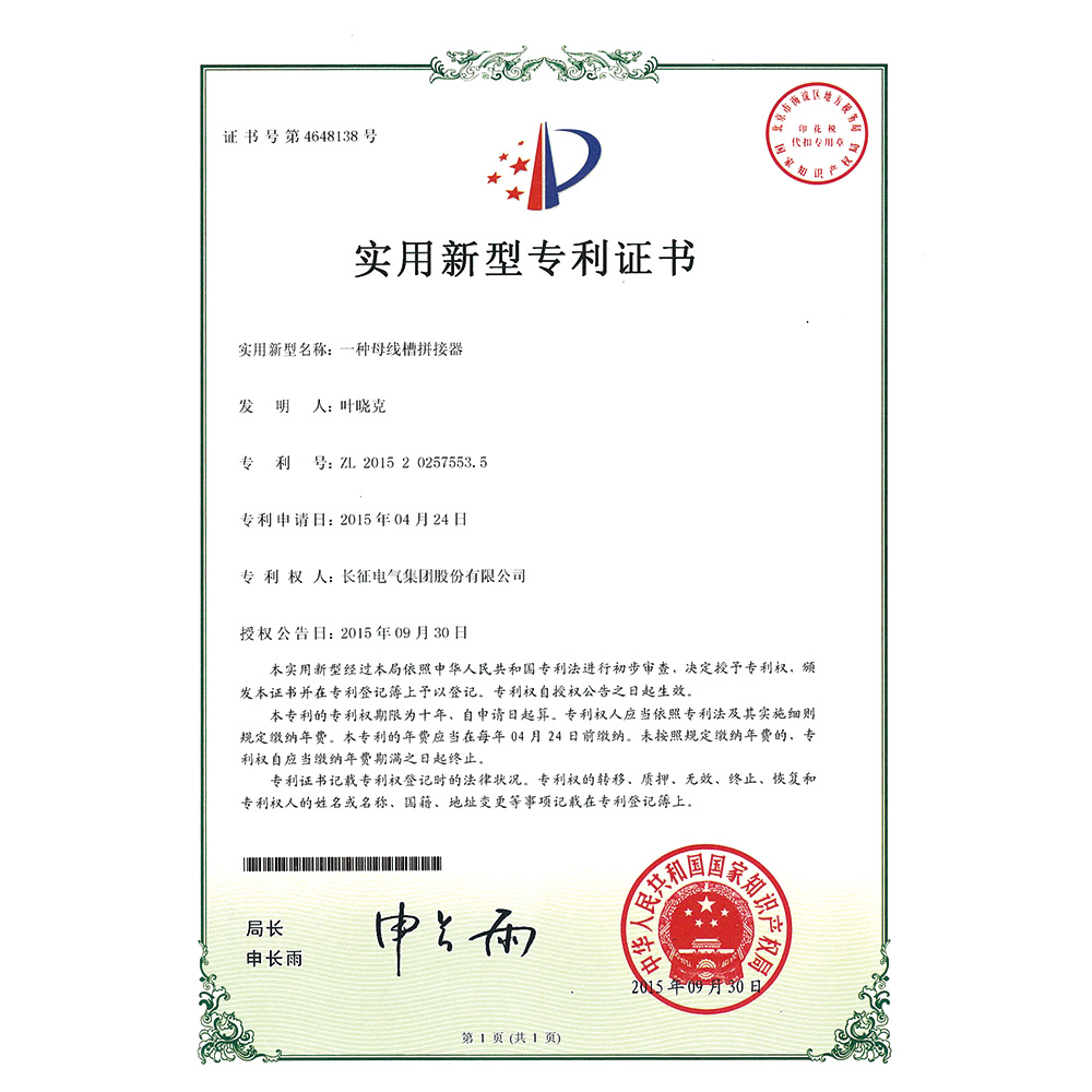 一种母线槽拼接器 实用新型专利证书