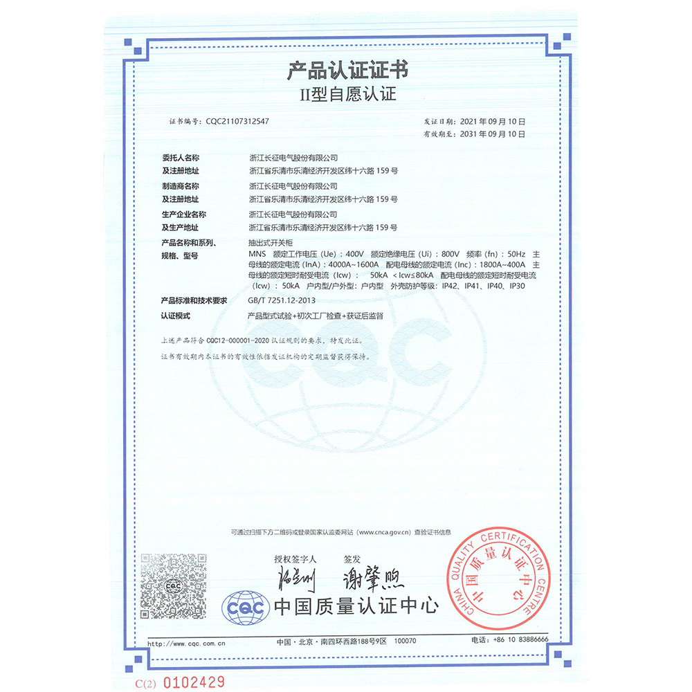 MNS抽出式开关柜 产品认证证书
