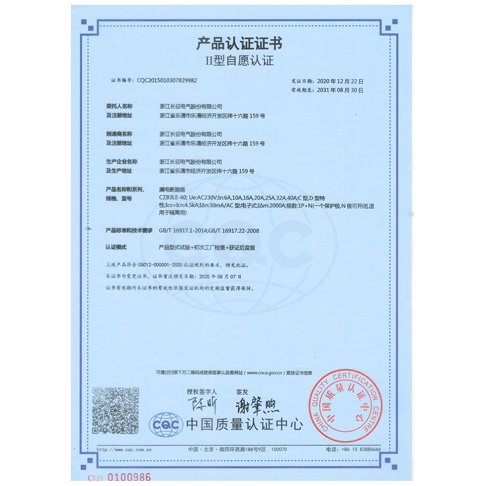 CZB3LE-40漏电断路器 产品认证证书