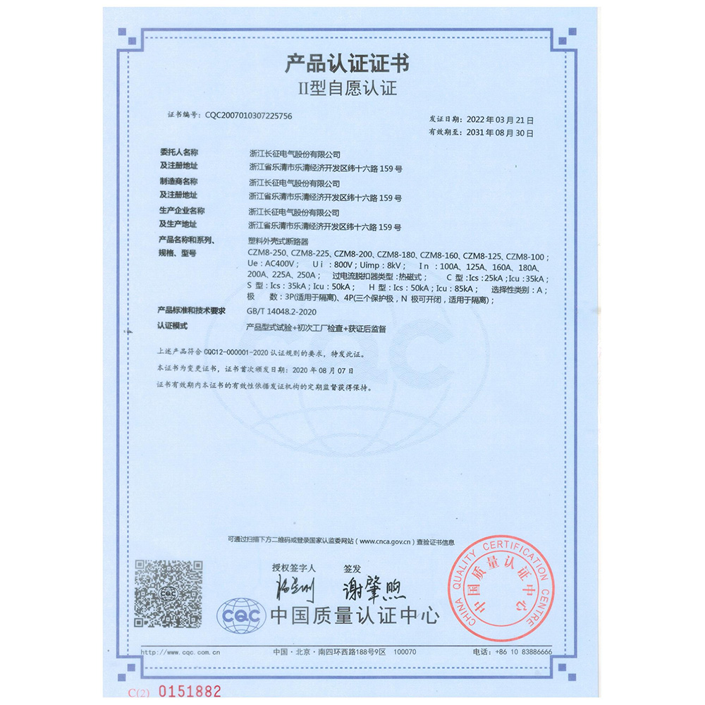 CZM8塑料外壳式断路器 产品认证证书
