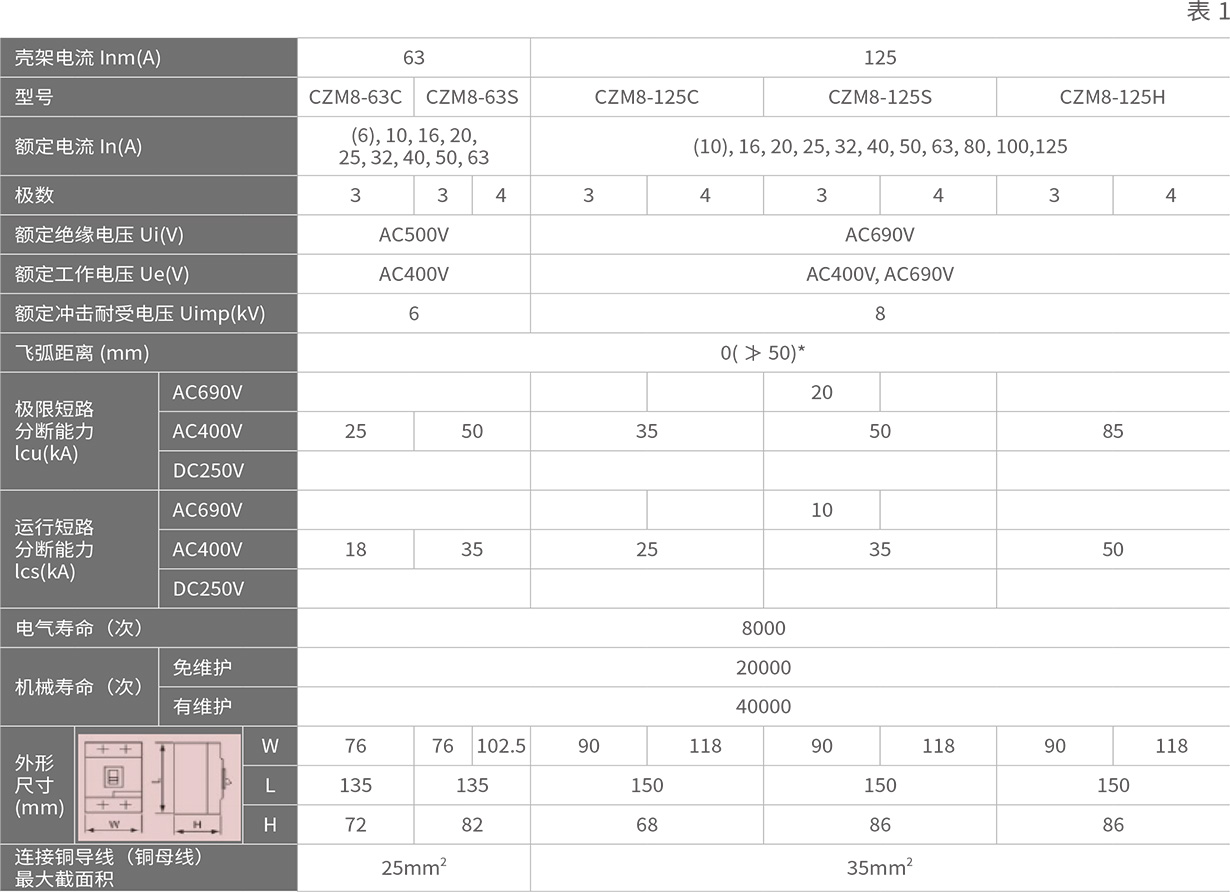 *CZM8-63/125 飞弧距离分“0”飞弧与 50mm 两种.应在订货时注明,四极断路器及 690V 规格无“0”飞弧。