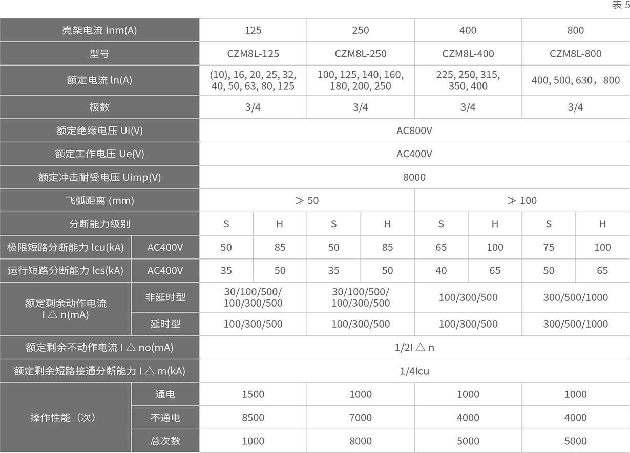 CZM8L 系列漏电断路器(以下简称断路器),适用于交流 50Hz.额定工作电压 400V.额定工作电流至 630A 的电路中作不频锴转换之用。断路器具有过载、短路和欠电压保护装置,能保护线路和电源设备不受损坏。漏电保护可对人身提供间接接艟保护也可为因线路设备泄漏电流或接地故障提供保护。断路器外形尺寸、安装尺寸与 CZM8 系列断路器同壳架等级产品完全相同。 断路器按照其额定极限短路分断能力(lcu)高低分为:S 型(较高分断型)、l- 型 ( 高分断型 ) 两类。该断路器具有体积小、分断高、飞弧短、抗振动等特点。适用范围